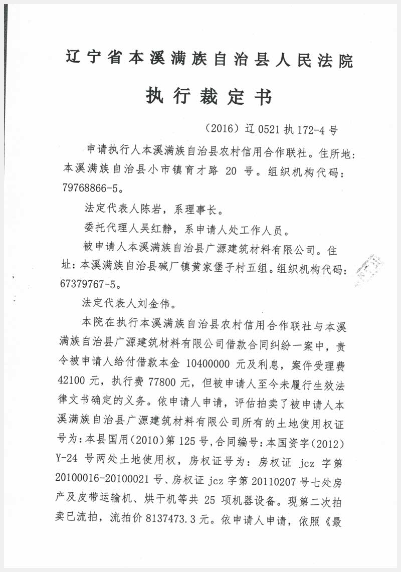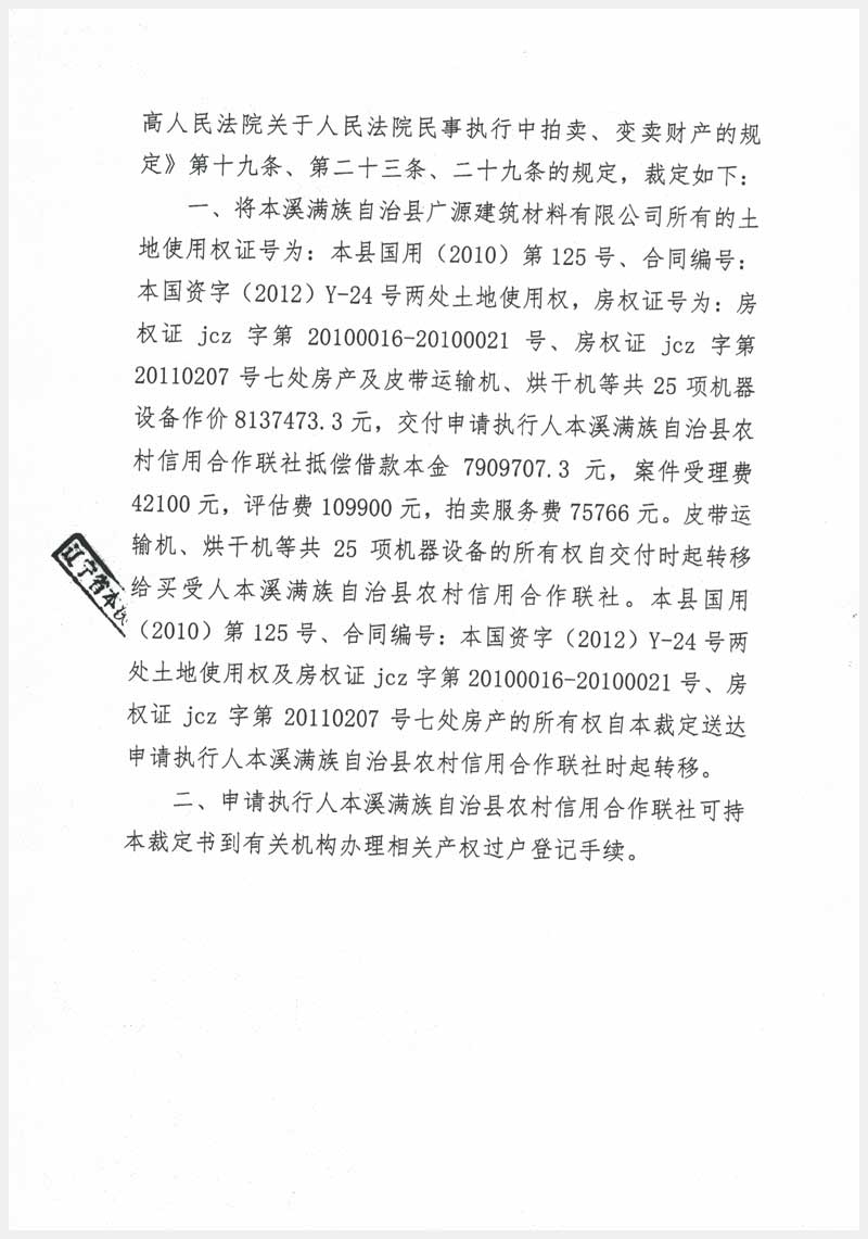名稱:本溪縣堿廠鎮(zhèn)黃堡村房產(chǎn)7處、土地2處及設(shè)備25項(xiàng) 面積:房產(chǎn):3241.16㎡、土地:9290㎡ 瀏覽次數(shù):2018