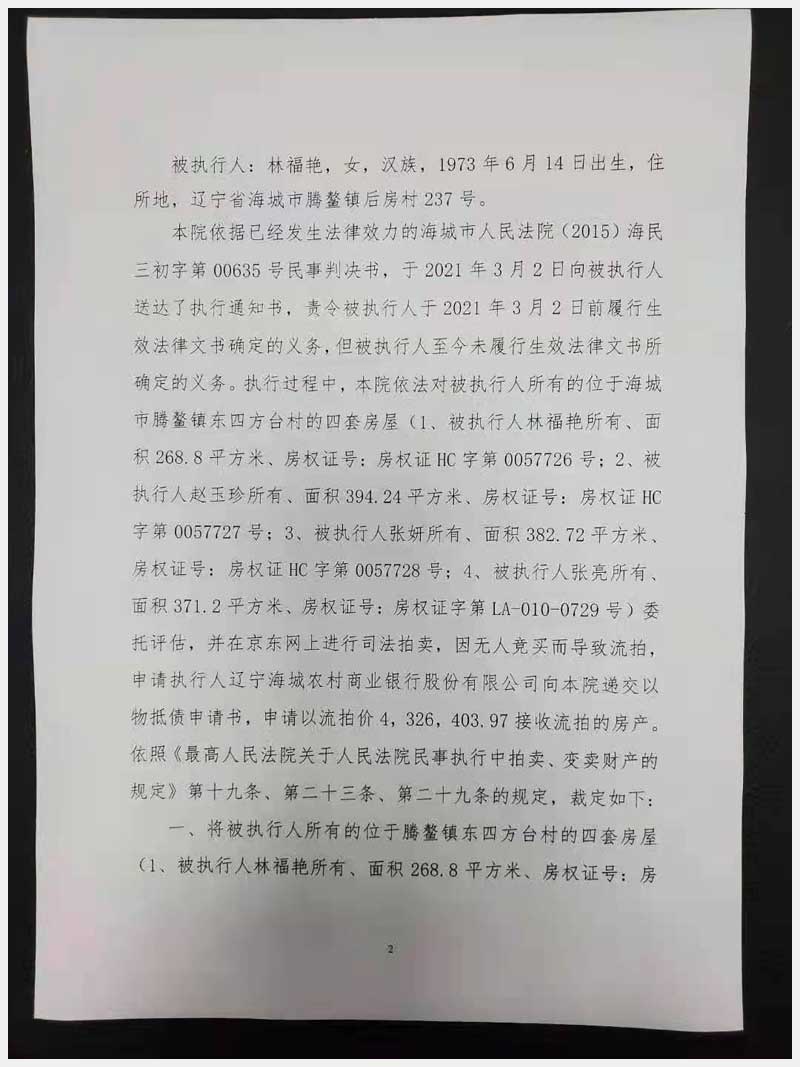 地址:海城市東四方臺鎮(zhèn)東四方臺居委會 標的號:155