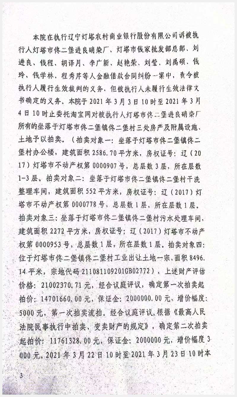 名稱:燈塔市佟二堡鎮(zhèn)佟二堡村房產(chǎn)及土地使用權(quán) 面積:房產(chǎn):5,410.7㎡;土地:8,496.14㎡ 瀏覽次數(shù):440